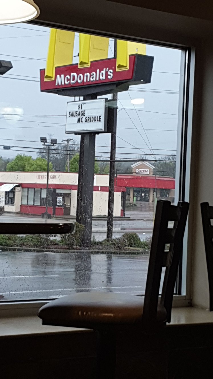 The hotel didn’t do breakfast so we opted for the cheapest option, McDonalds, for sausage mcmuffins and coffee. It was overcast when we left for McDonalds but it started to rain while we were there.