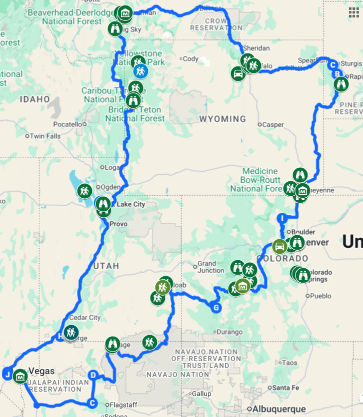 | 17 | Mount Rushmore – Buffalo | Drive into Wyoming and head to Buffalo. US Highway 16 (Cloud Peak Skyway Scenic Byway) Historic Occidental Hotel & SaloonJim Gatchell Memorial Museum: Mountain Meadow Wool Mill Lake DeSmet: Dry Creek Petrified ForestWyoming In Color Art Gallery: |